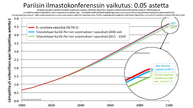 Pariisin ilmastosopimus hyväksyttiin YK:n ilmastokokouksessa joulukuussa 2015 ja se astui voimaan 4.11.2016. Sopimus, jonka on ratifioinut Suomen lisäksi 143 maata, ei kuitenkaan sisällä määrällisiä päästövähennysvelvoitteita. Osapuolet sitoutuvat pelkästään valmistelemaan, tiedottamaan, ylläpitämään sekä saavuttamaan ilmoittamansa päästötavoitteet. EU-maita ja muutamia muita kehittyneitä länsimaita lukuun ottamatta muut maat, mm. Kiina ja Intia, eivät ole ilmoittaneet vähentävänsä hiilidioksidipäästöjään. Ensimmäinen kokonaistarkastelu sopimuksen vaikutuksista tehdään 2023.